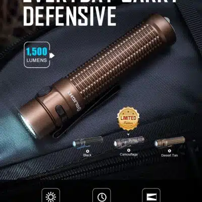 The Olight S2R Baton II Limited Edition Desert Tan is a rechargeable version of the very popular S2 Baton but is more compact, with an 1150 Lumen max output. The magnetic USB powered recharging system connects with ease without having to worry about removing a cover or plugging into the flashlight. The high capacity 3200mAh 18650 rechargeable Lithium-Ion battery allows for long run-times between charging, as well as long term cost savings. The simple one button operation with lock out mode, makes for a convenient pocket carry light for everyday use.